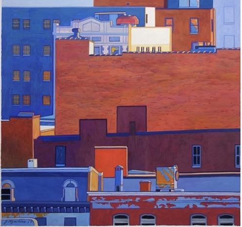 In this painting, I’m intrigued by how the built environment organizes itself into distinct planes of color and linear structures.