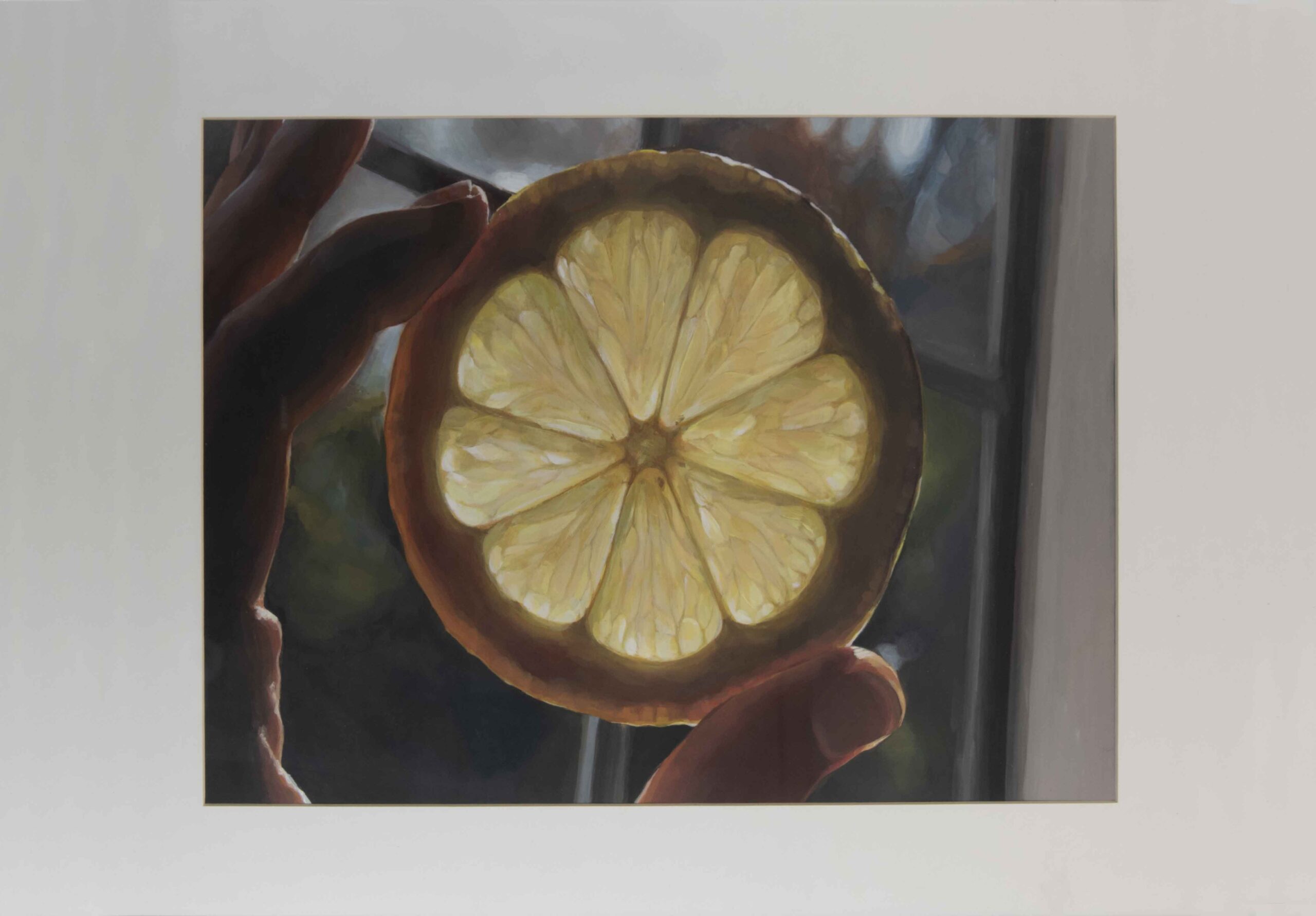 The pulp of citrus fruits have a translucent quality when observed in the light, making them appear to glow. I aimed to capture this property in a slice of lemon using acrylic paint and gouache.