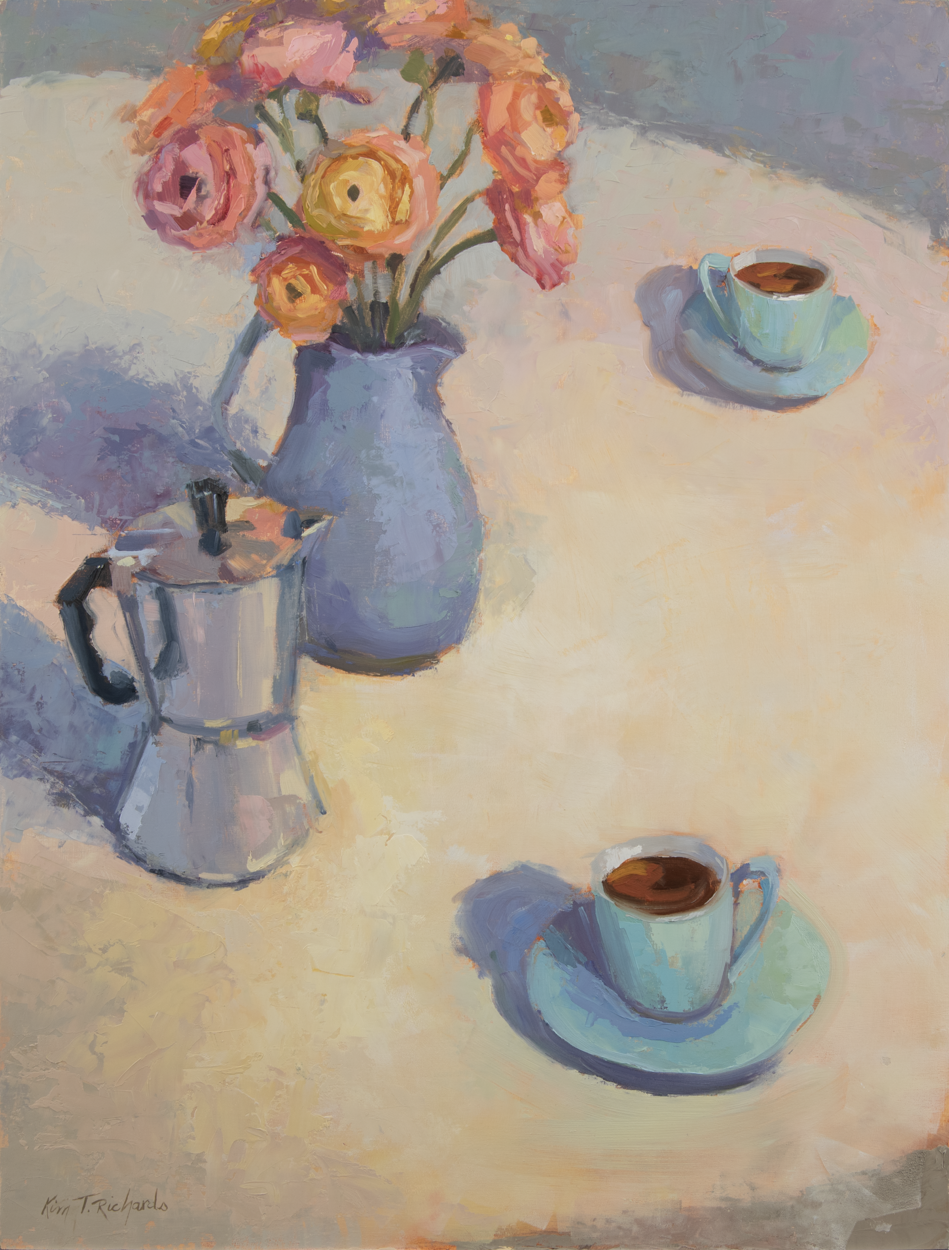 I paint my still life paintings from objects that I set up in the studio. They are on a table that is behind me, so that each time I step back to look at them, I’m in a slightly different place. Sometimes, I will even move my light source so that the shadows go in different directions. I do this to symbolize trying to find a feeling of calm when life feels a little too chaotic.
